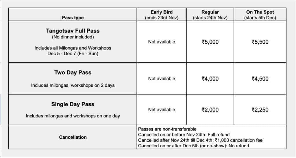 Your full pass includes workshops. We’ve planned tango activities with a live band. Members of Pune Tango Community will perform.